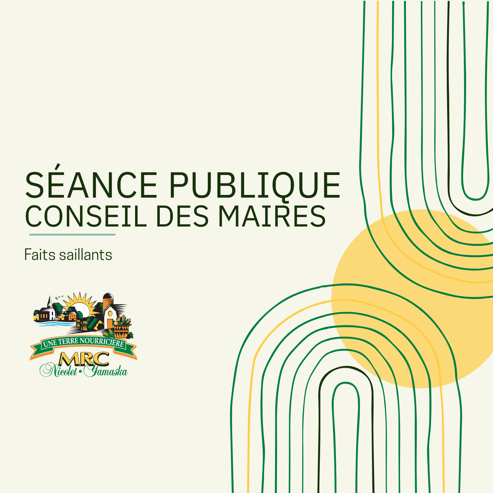 La séance publique du conseil des maires de la MRC de Nicolet-Yamaska s'est tenue le 18 mars 2026 au centre administratif de la MRC. Vous pouvez visionner cette séance ici.