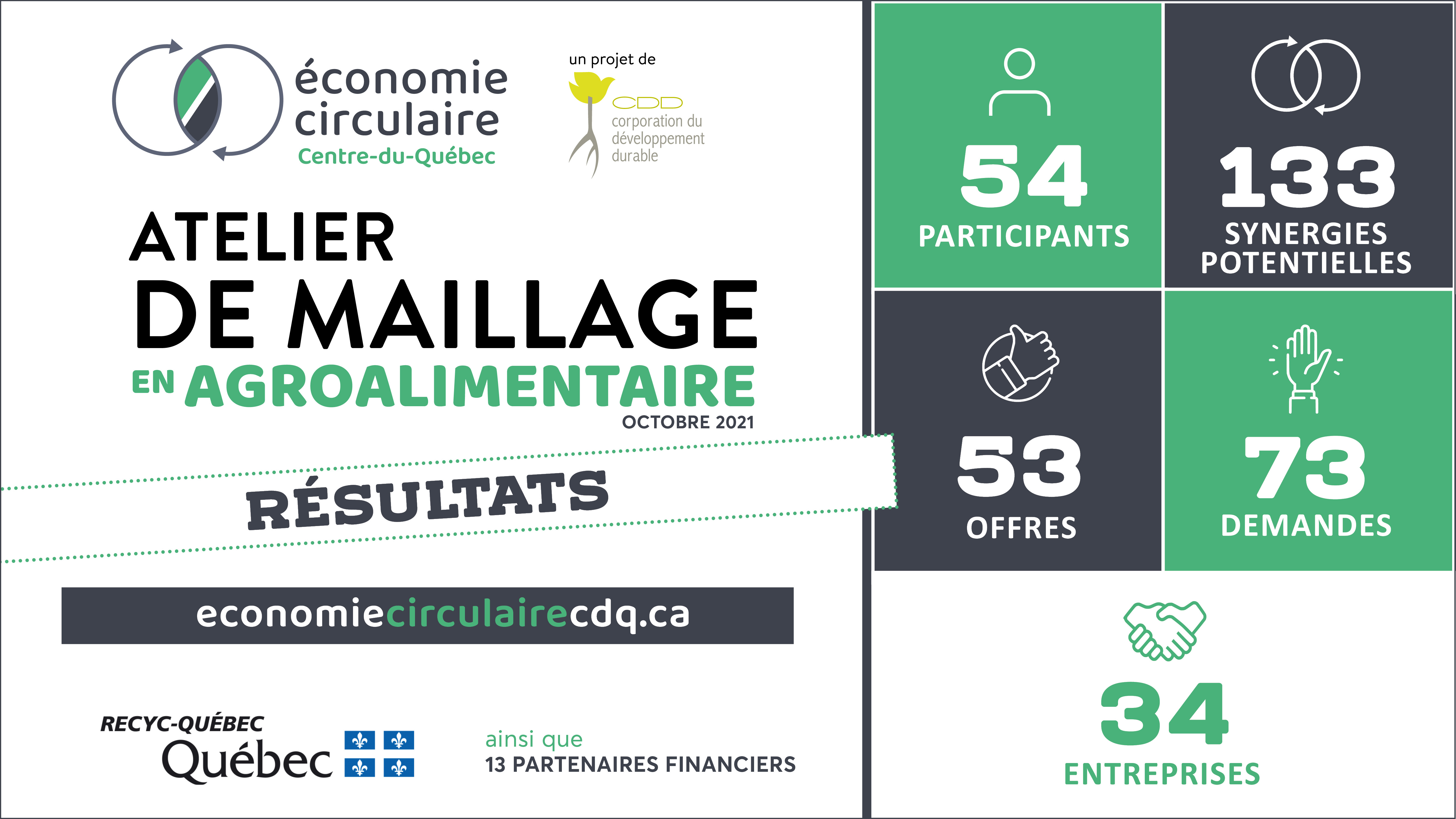 Centre-du-Québec (Victoriaville), le 4 novembre 2021. ‐ Pari réussi pour le tout premier atelier de maillage du projet Économie circulaire Centre-du-Québec tenu le jeudi 27 octobre 2021. Cet événement, ciblant les entreprises en transformation alimentaire et les producteurs agricoles, avait comme objectif d'accélérer l'implantation de stratégies en économie circulaire dans les entreprises des MRC de Bécancour, d'Arthabaska, de L'Érable et de Nicolet-Yamaska. Quatre grands thèmes ont été abordés lors de cet atelier soit : la récupération des résidus, le partage de ressources, l'optimisation de la production et l'écoconception des emballages.