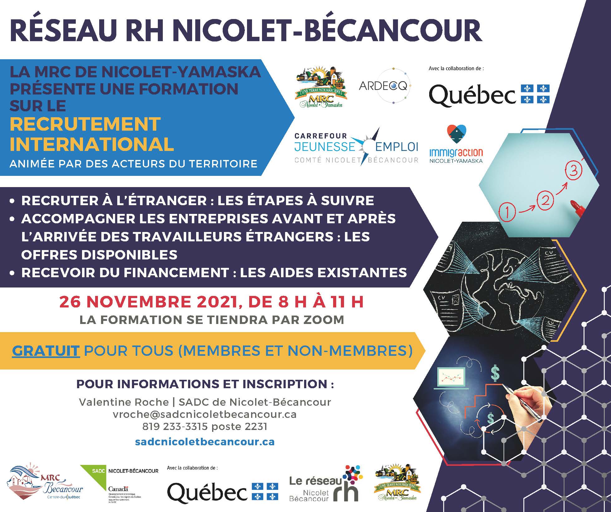 Dans le cadre du Réseau RH, la MRC de Nicolet-Yamaska organise une formation pour les entreprises portant sur le recrutement international. Cette formation qui se déroulera sur Zoom, sera présentée le 26 novembre 2021. L'objectif principal de cette formation est de présenter le processus de recrutement, l'accompagnement offert avant, pendant et après le recrutement, de même que les aides financières disponibles. Lors de la formation, les intervenants suivants prendront la parole :
