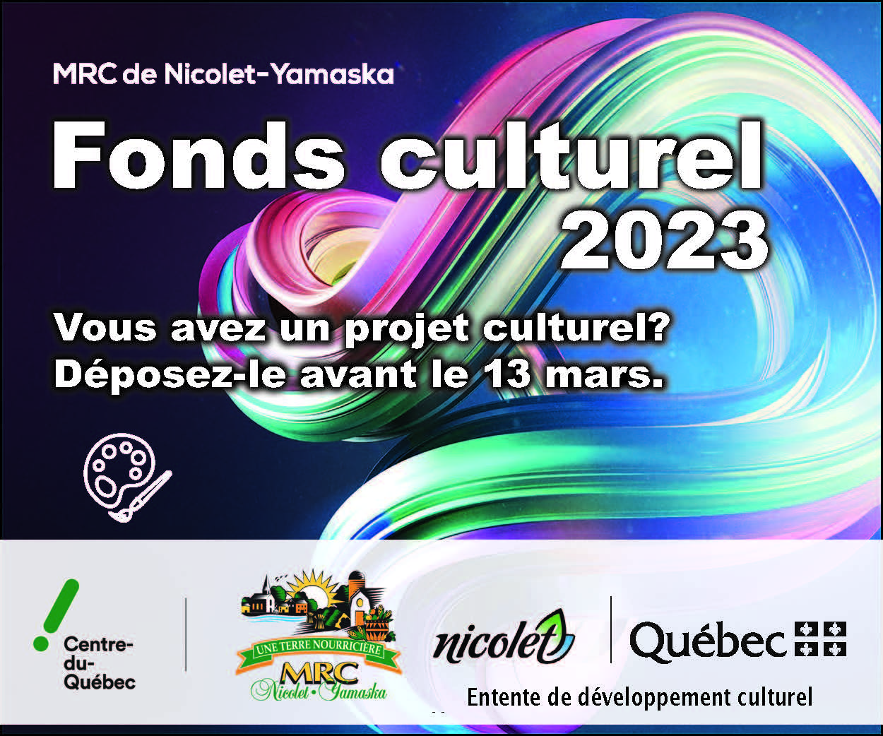 Nicolet, le 22 février 2023 - Le Fonds de développement culturel 21-23 est de nouveau accessible pour les artistes de la MRC de Nicolet-Yamaska. C'est près de 20 000$ qui serviront à soutenir le milieu culturel.