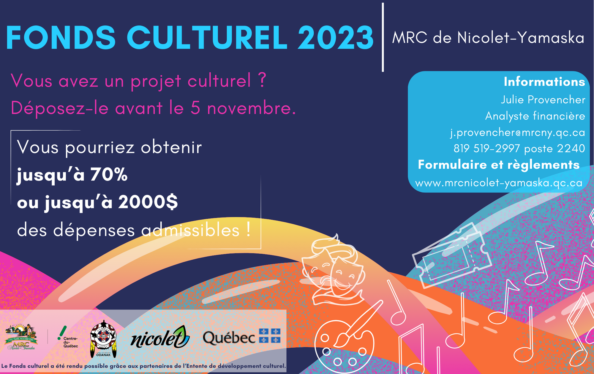 Toutes les informations pertinentes aux règles du Fonds de développement culturel sont accessibles sur le site internet de la MRC au www.mrcnicolet-yamaska.qc.ca, section Culture et Patrimoine. Pour toute question liée au Fonds culturel, contactez l'analyste financière de la MRC de Nicolet-Yamaska, Julie Provencher, au j.provencher@mrcny.qc.ca ou au 819-519-2997 poste 2240.