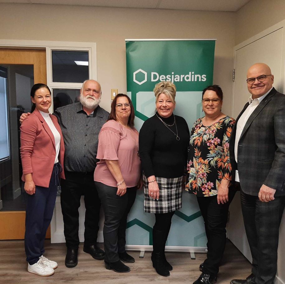 Sur la photo : De gauche à droite : Valérie Lamothe (coordonnatrice en loisirs), Réal Deschênes (maire), Carole Hélie (directrice générale), Chantal Dionne (adjointe administrative), Nathalie Mathieu (représentante de la Caisse Desjardins Godefroy) et Michel Grenier (directeur général de la Caisse Desjardins Godefroy).