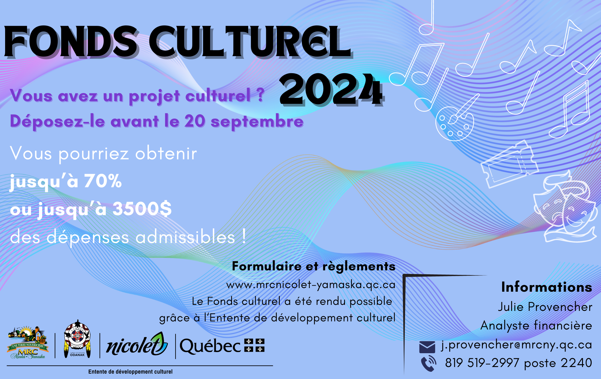 Toutes les informations pertinentes aux règles du Fonds de développement culturel sont accessibles sur le site internet de la MRC. Pour toutes questions liées au Fonds culturel, contactez l'analyste financière de la MRC de Nicolet-Yamaska, Julie Provencher, j.provencher@mrcny.qc.ca ou 819-519-2997 poste 2240.