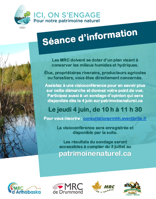 Dans le cadre de la réalisation des plans régionaux des milieux humides et hydriques, quatre MRC du Centre-du-Québec se mobilisent pour réaliser cette démarche obligée du gouvernement du Québec. Afin d'y intégrer l'ensemble des enjeux du territoires et permettre à tous de s'exprimer, un webinaire est organisé le 4 juin 2020. Les objectifs de cette rencontre d'échange sont de vous présenter la démarche, échanger sur votre vision de la conservation des milieux naturels et identifier les enjeux.