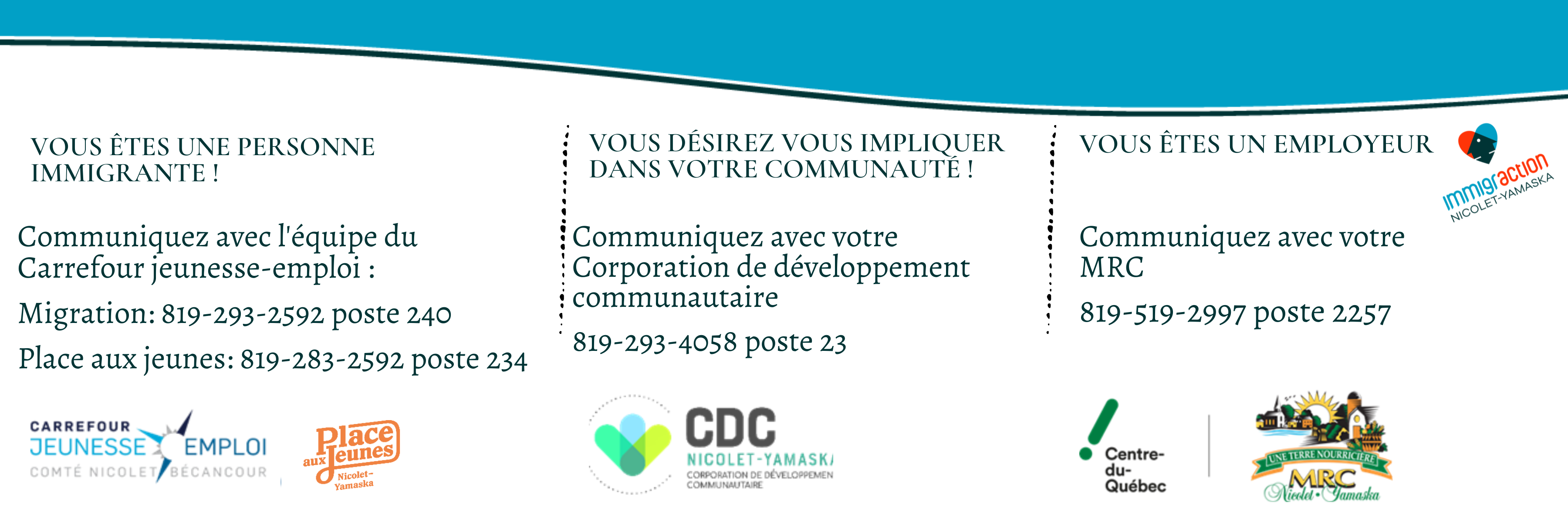Le Carrefour Jeunesse Emploi comté Nicolet-Bécancour offre des services d'accompagnement pour l'accueil, l'installation et l'intégration des personnes immigrantes sur le territoire de la MRC de Nicolet-Yamaska.